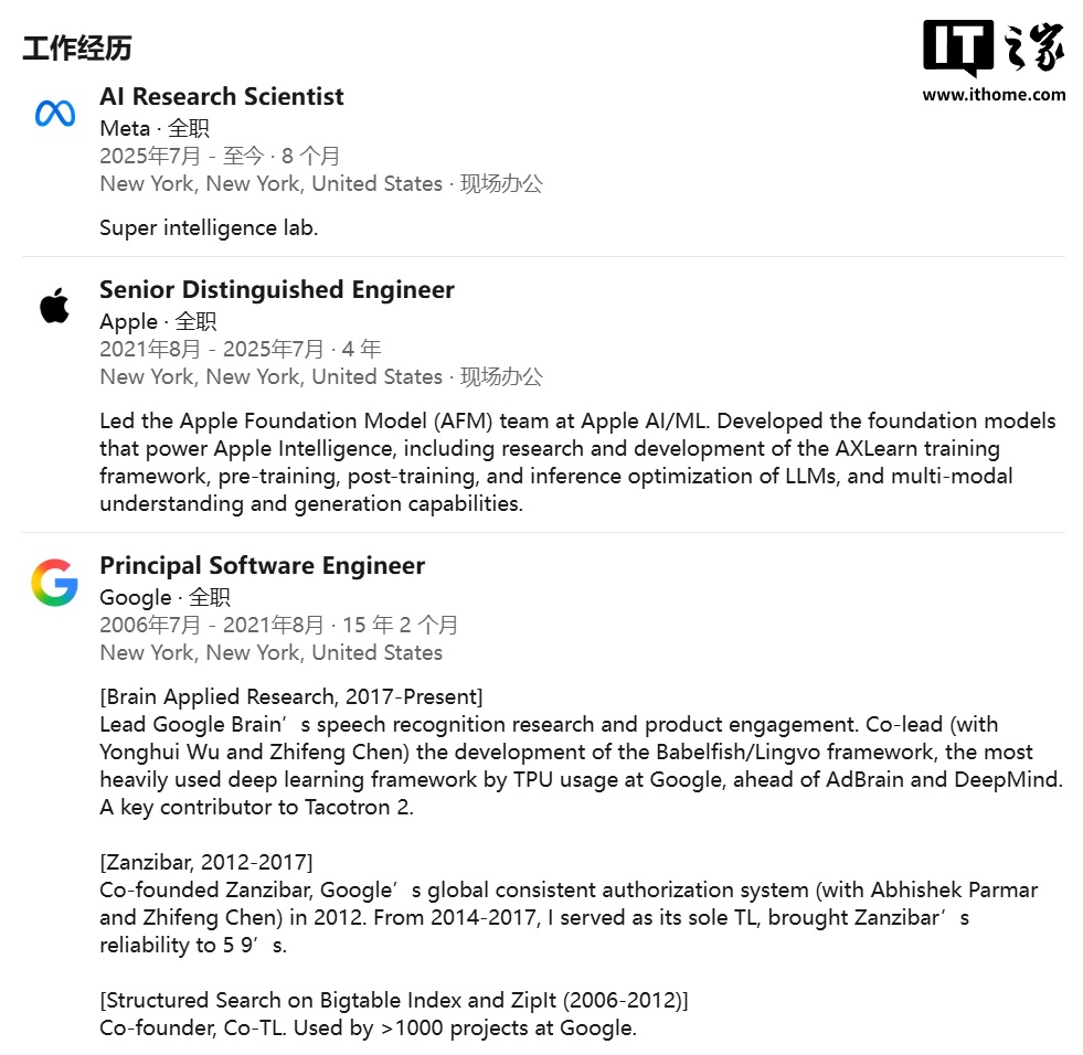 庞若鸣曾是苹果基础模型团队(FoundationModels,简称AFM)的核心负责人,在苹果领导着一支约100人的团队,负责开发大型语言模型(LLMs),而这些模型构成了AppleIntelligence和其他AI功能的基石。