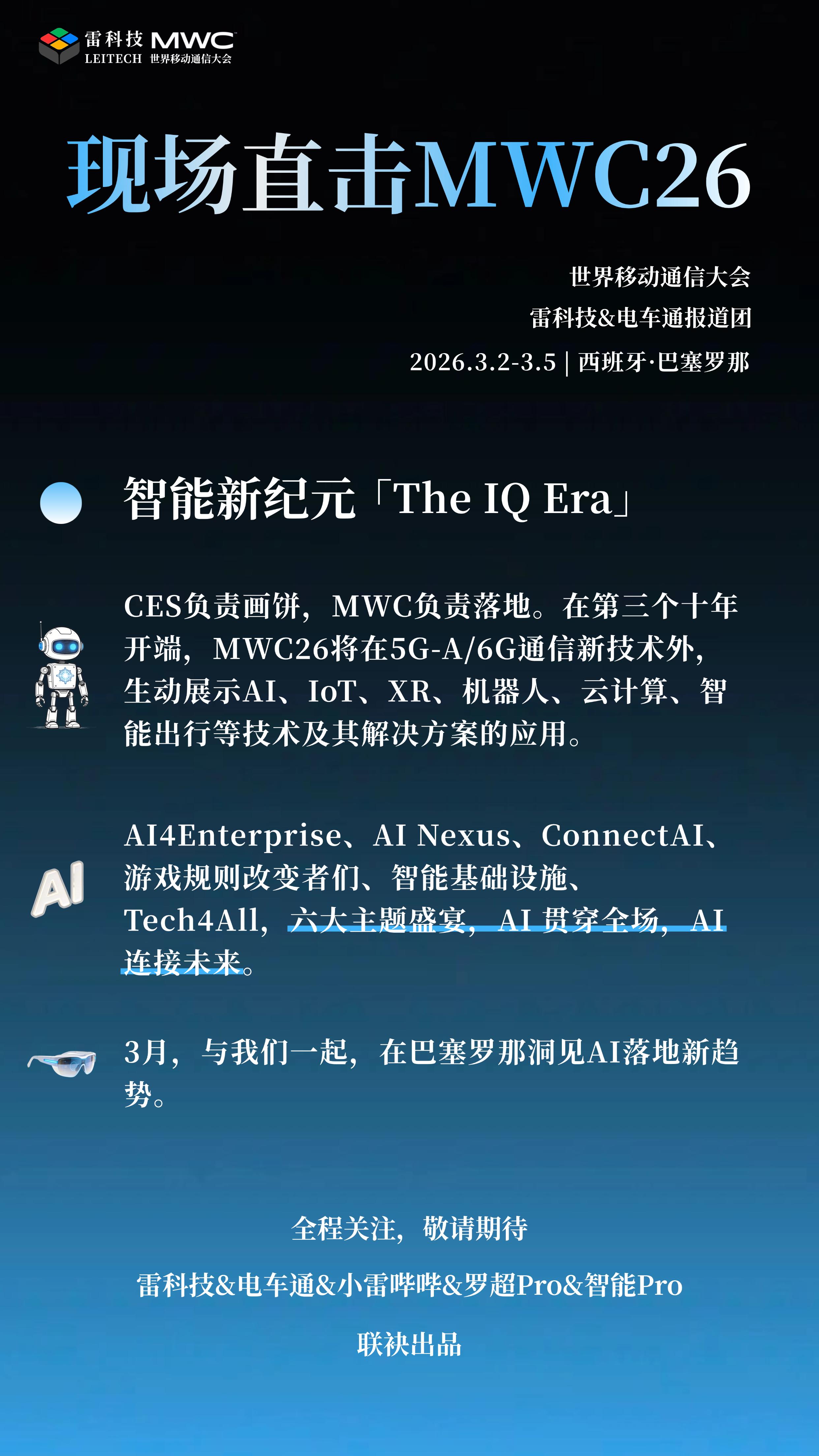 MWC(世界移动通信大会)26主题是智能新纪元「The IQ Era」,将在5G-A/6G通信新技术外,生动展示AI、IoT、XR、机器人、云计算、智能出行等技术及其解决方案的应用。
