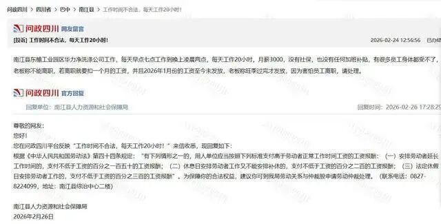 网友投诉信息显示,南江县东榆工业园区华力净洗涤公司工作,每天早上七点工作到晚上凌晨两点,每天工作19小时,月薪3000元,没有社保,也没有任何加班补贴,有很多员工身体都受不了。老板称不能离职,若离职就要扣一个月的工资,并且2026年1月份的工资至今未发放,老板称旺季过完才发放,因为害怕员工离职。