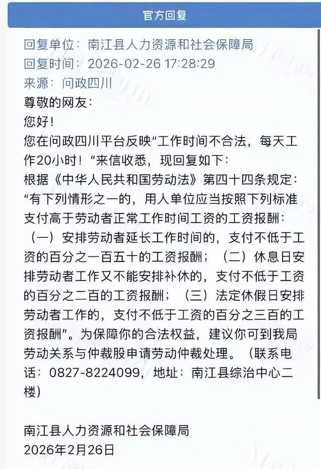 2月26日,南江县人力资源和社会保障局回复称,根据我国《劳动法》第四十四条规定:“有下列情形之一的,用人单位应当按照下列标准支付高于劳动者正常工作时间工资的工资报酬:(一)安排劳动者延长工作时间的,支付不低于工资的百分之一百五十的工资报酬;(二)休息日安排劳动者工作又不能安排补休的,支付不低于工资的百分之二百的工资报酬;(三)法定休假日安排劳动者工作的,支付不低于工资的百分之三百的工资报酬”。为保障你的合法权益,建议你可到我局劳动关系与仲裁股申请劳动仲裁处理。