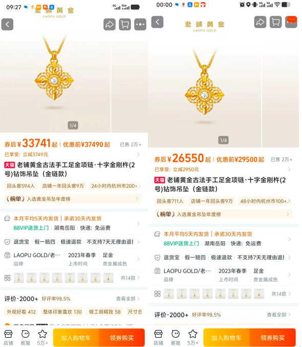 2月28日,潮新闻记者在老铺黄金天猫旗舰店查询发现,以中号肖邦款重约13.39克的十字金刚杵(2号)钻饰吊坠款为例,调价前券后售价为26550元;9时许,同款商品在享受平台满1000减100券后价为33741元,涨价超7000元,调价幅度超27%。
