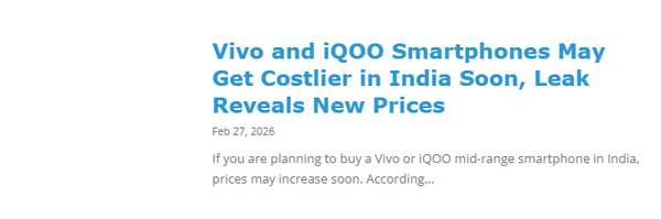 [CNMO科技消息]自2025年下半年起,因存储芯片成本不断攀升,数码电子行业掀起涨价潮,手机、电脑、平板等产品价格纷纷上扬。如今,这股涨价风潮即将蔓延至印度市场。据外媒报道,vivo及其旗下品牌iQOO等将上调多款手机在印度市场的售价,调整后的价格预计自3月1日起开始执行。