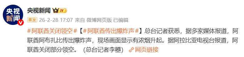 央视新闻获悉,据多家媒体报道,阿联酋阿布扎比传出爆炸声,现场画面显示有浓烟升起。据阿拉比亚电视台报道,阿联酋关闭部分领空。