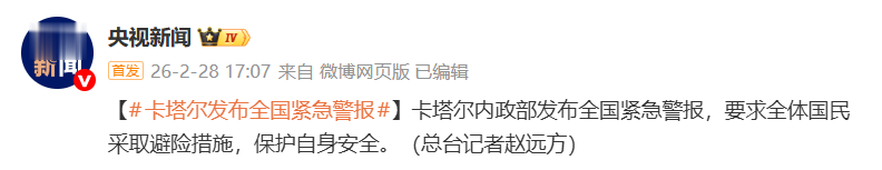 卡塔尔内政部发布全国紧急警报,要求全体国民采取避险措施,保护自身安全。