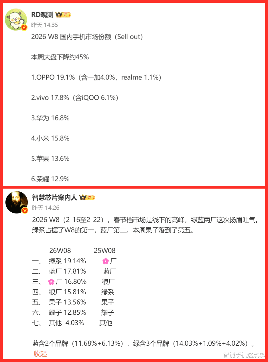 而且厂商的发展策略会体现在手机周报份额榜单中,比如2026年第8周(2月16日至2月22日),国内手机市场份额迎来开年最大洗牌。