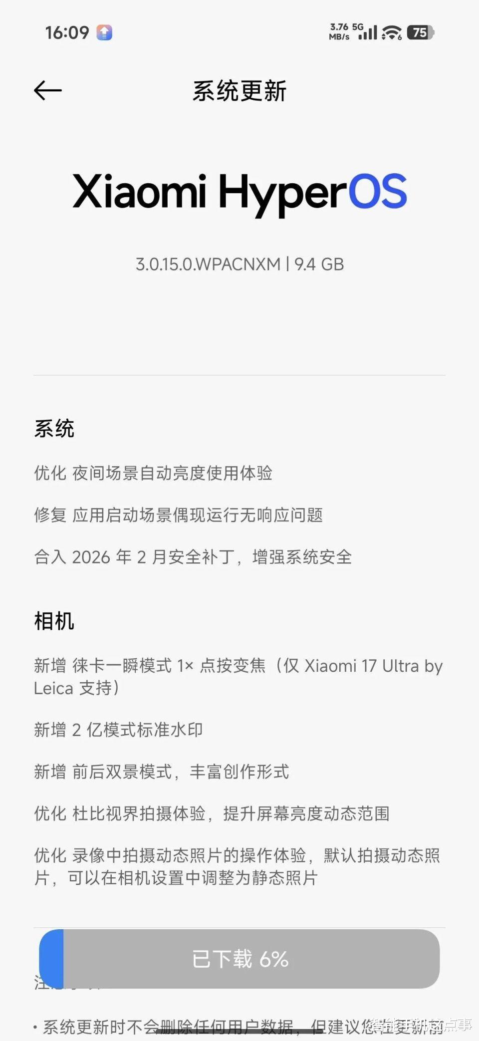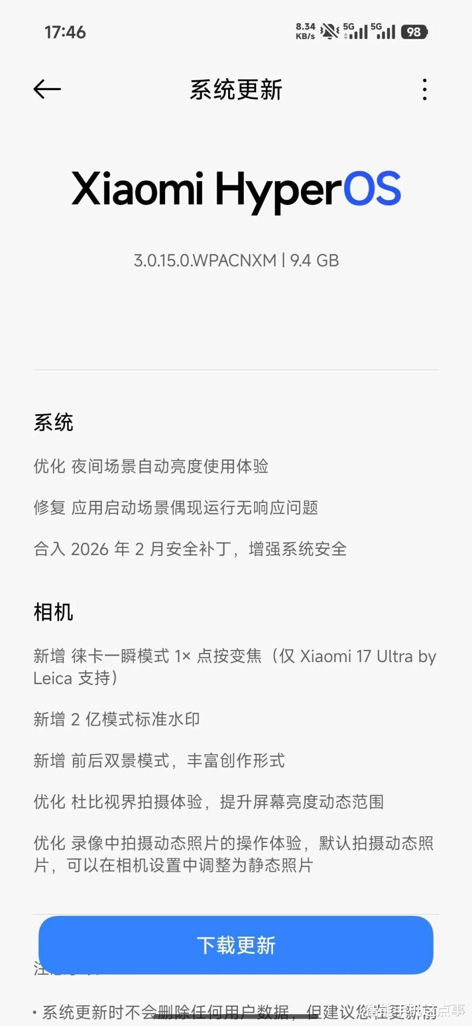 不得不说,当笔者看到手中小米17 Ultra收到超大更新包的时候真的有一些惊讶,原因是太大了,达到了9.4GB,真的有一些夸张。