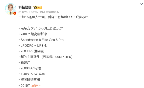 在用户最为关心的续航方面,一加16的堆料同样堪称“疯狂”。爆料显示,一加16的电池容量或将突破至9000mAh,支持120W有线快充和50W无线快充。其他配置上,一加16预计将配备双同轴扬声器、升级的O916T振动马达,并采用超声波指纹识别2.0技术,防护等级可能达到IP69级别。