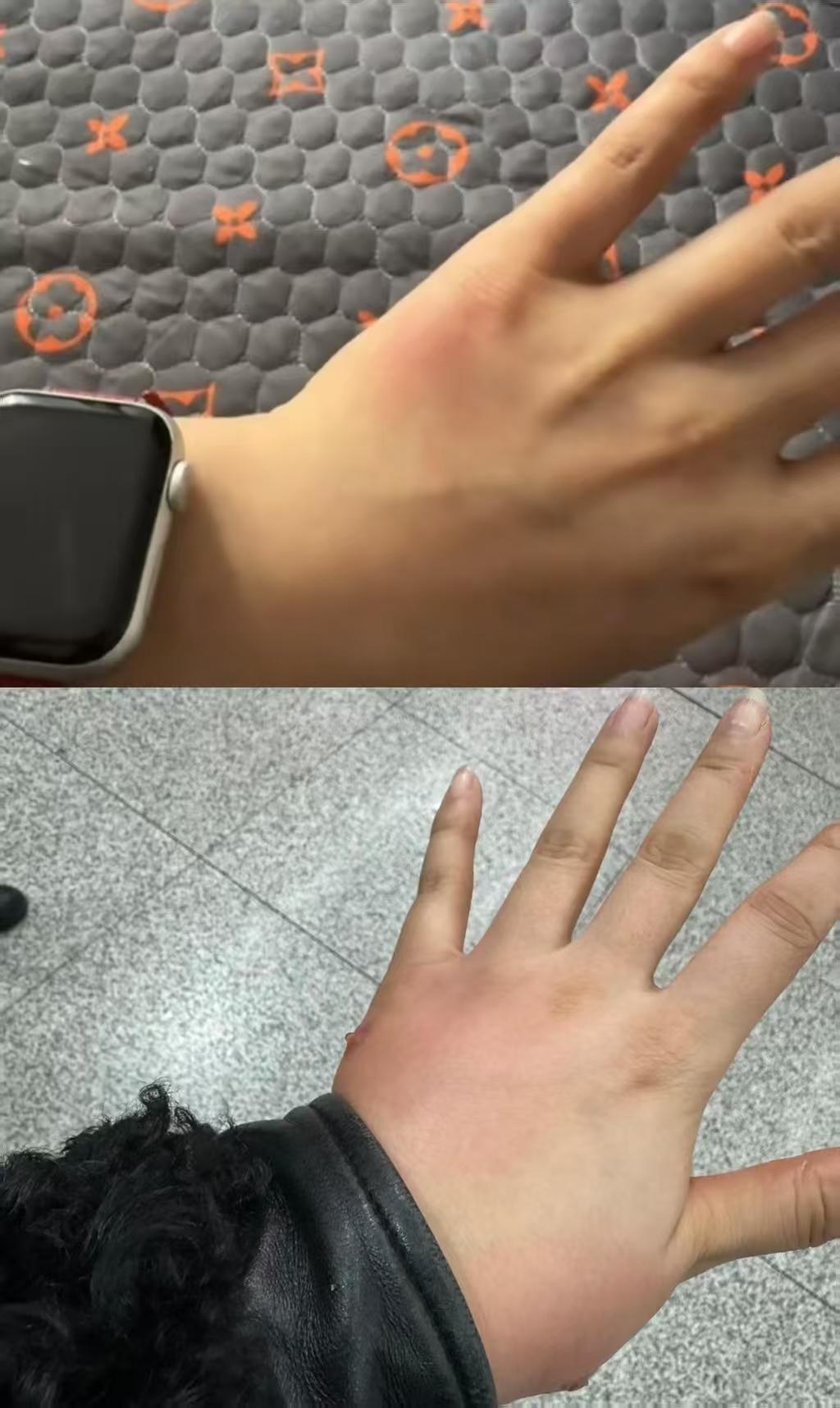 据佟女士发布图片,被咬的伤口从一开始的小红点恶化成了两个脓包,整只左手肿如馒头。“我是荨麻疹体质,脖子、后背、脸都很痒。”她说。