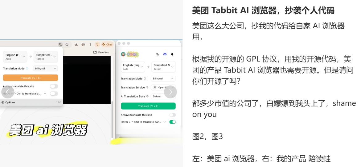3月3日消息,美团旗下光年之外团队近日因新发布的TabbitAI浏览器陷入代码抄袭争议。有开发者指出,其内置翻译功能疑似使用了个人开源项目“read-frog”(昵称“陪伴蛙”)的代码。