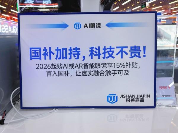 在远望数码商城AI+AR智能眼镜体验馆,本报记者看到,价格从2996元到5396元不等的AI眼镜整齐陈列,显眼位置打着醒目标语:“国补加持,科技不贵”“2026年起购AI或AR智能眼镜享15%补贴,首入国补,让虚实融合触手可及!”