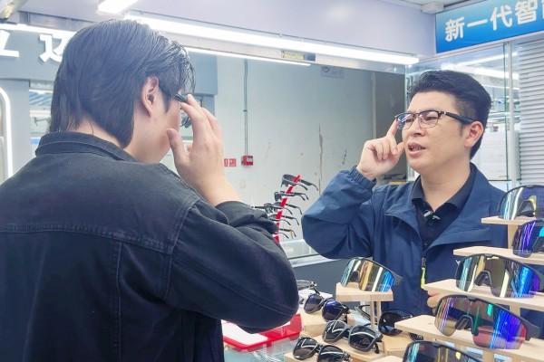 记者在该店铺看到,货架上摆满各式AI眼镜,店员正拿着墨镜向顾客热情介绍。记者试戴了一款售价不到200元的商务AI眼镜——通过蓝牙连接手机专用APP后,轻轻触碰右侧镜腿,眼镜便自动切换到通话模式,无需掏手机即可清晰接听电话。刘天才向记者介绍,这款产品支持音乐播放、对话翻译等功能,续航达8小时,他特别强调:“我们做的功能主要注重性价比、实用性和轻便性,把大家常用的基本功能做到极致。”