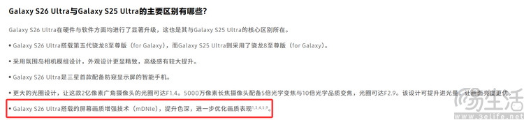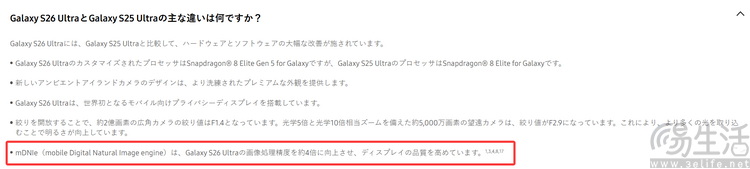 另一方面,就算是三星,在此前关于Galaxy S26系列的宣传文案里,其实也有各种暗示其显示效果升级到了10bit的细节。比如在日本官网,就可以找到有说法称,“移动数字自然图像引擎 (mDNIe) 将图像处理精度提高了四倍”。而8bit面板和10bit面板之间的发色数差距,恰好就是四倍。