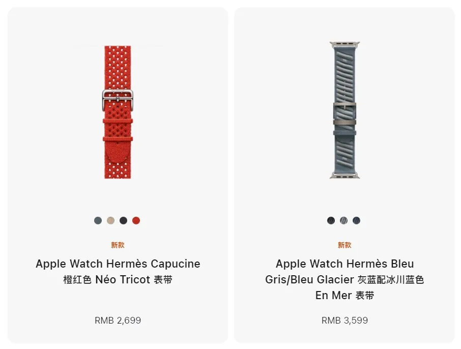 两款爱马仕联名款表带则分别新增了橙红色和灰蓝配冰川蓝色,售价分别为2699元和3599元。