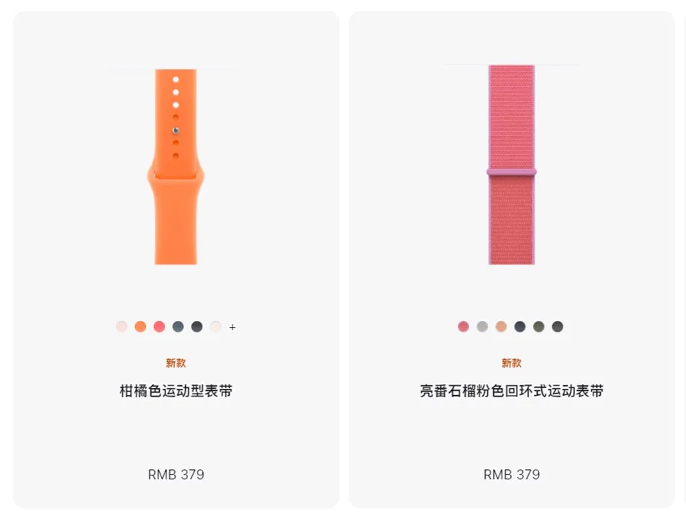 其中运动型表带新增了浅粉色/柑橘色/亮番石榴粉;回环式运动表带新增了雾蓝色/蜜瓜色/亮番石榴粉;这两款表带的售价均为379元。