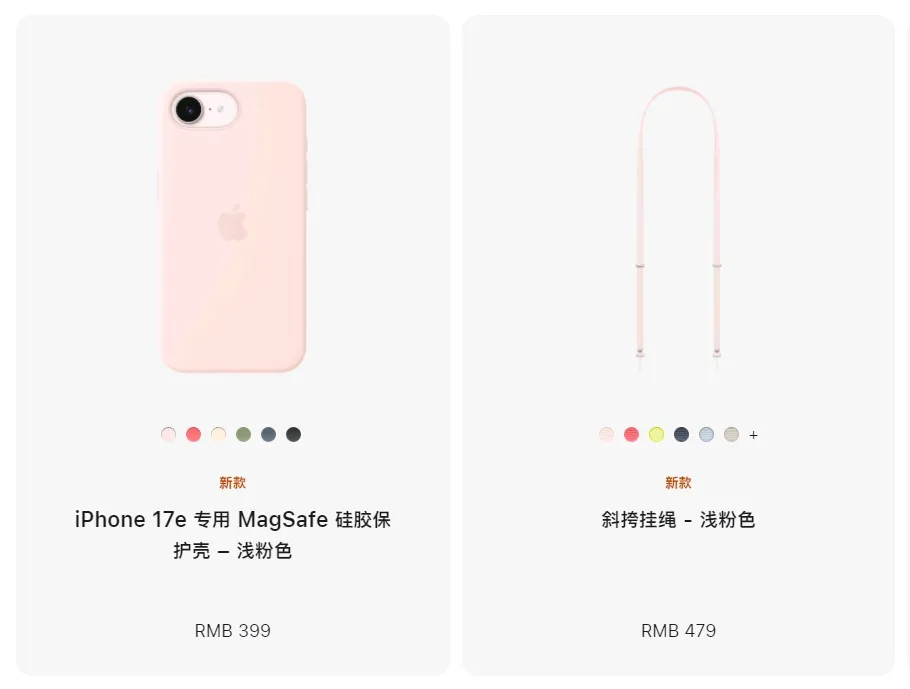 首先为iPhone 17e推出了2款专属保护壳,一款为硅胶保护壳,提供了6款配色;另一款则为透明保护壳;两款均支持MagSafe,且售价均为399元。
