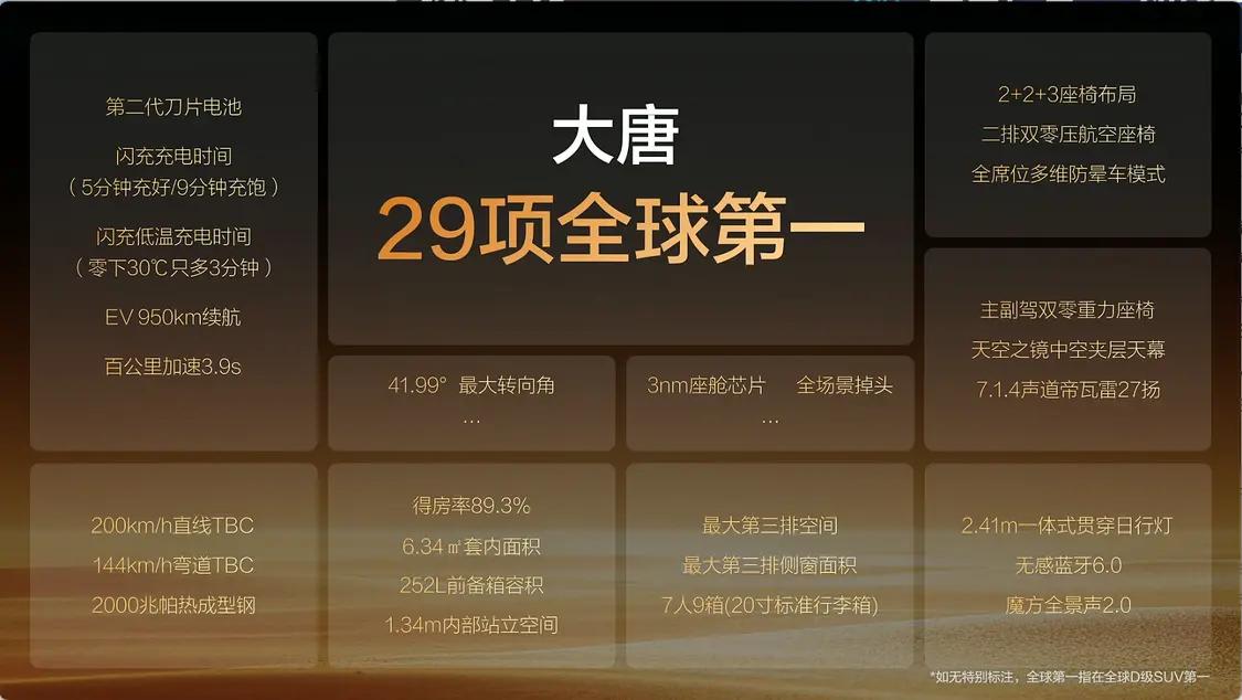 大唐这次是尺寸、续航、动力、配置全拉满。950公里纯电续航,3.9秒破百,5米3的车身,后轮转向,云辇悬架,激光雷达——29项全球第一。