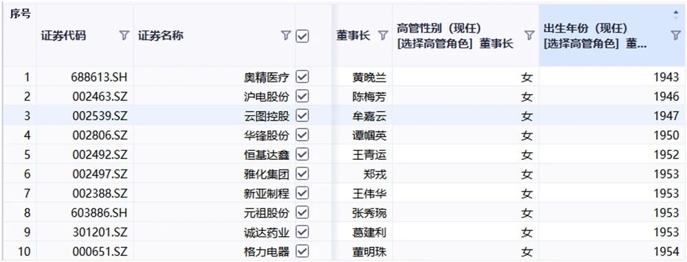 A股最年长的女董事长是黄晚兰,她出生于1943年,今年83岁,现任奥精医疗董事、董事长。