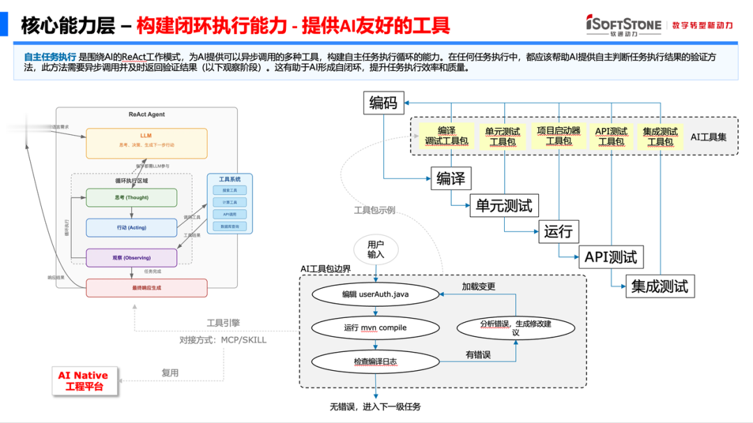 即便有完善的上下文支撑,AI模型仍存在不确定性,生成的代码、文档可能出现语法漏洞、逻辑偏差等问题。若依靠人工校验,既耗时费力又违背AI提效的核心目标。ASDM围绕“为AI设计工具”的理念,整合了编译器、调试器、单元测试工具、API测试工具等软件工程领域的成熟工具,搭建起AI的“专属工具矩阵”。