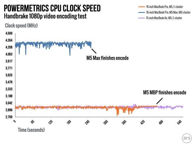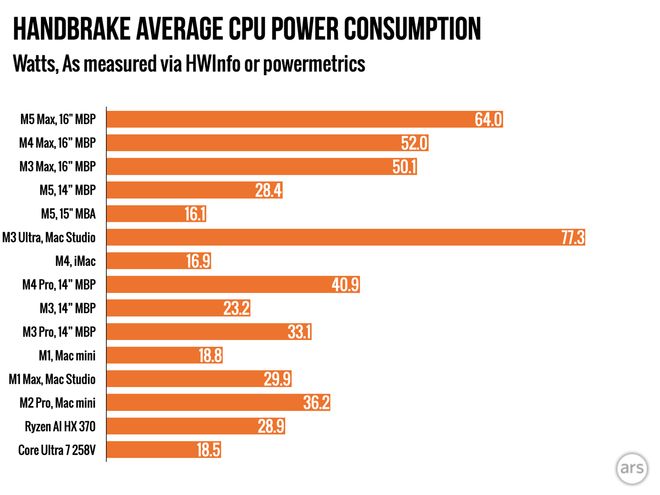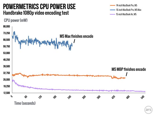 尽管性能大幅跃升,新芯片的能耗表现依然符合苹果的严苛标准。在Handbrake视频编码的高负载测试中,M5Max的平均功耗较M4Max增加了约23%。