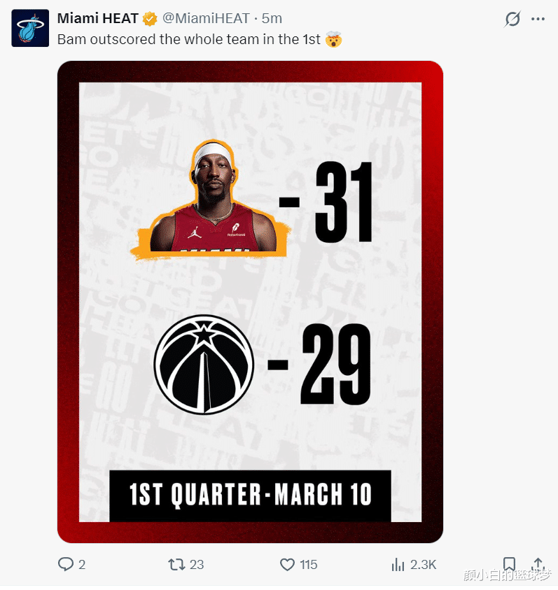 这场比赛因为奇才的防守太差,阿德巴约开场就等于是投篮训练,单节12分钟,16中10,三分8中5,罚球7中6,拿到31分3篮板1抢断1盖帽,命中率62.5%,奇才全队才29分。