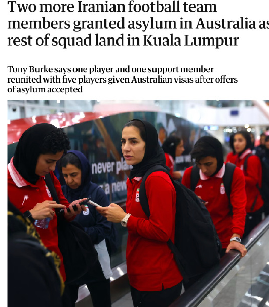 据悉,这两位登机前决定留在澳大利亚的人员,分别是一位伊朗女足球员和一位球队的后勤人员。当晚晚些时候,这两位伊朗女足成员便与5名队友重聚,这5位队友在前一天已作出相同决定。
