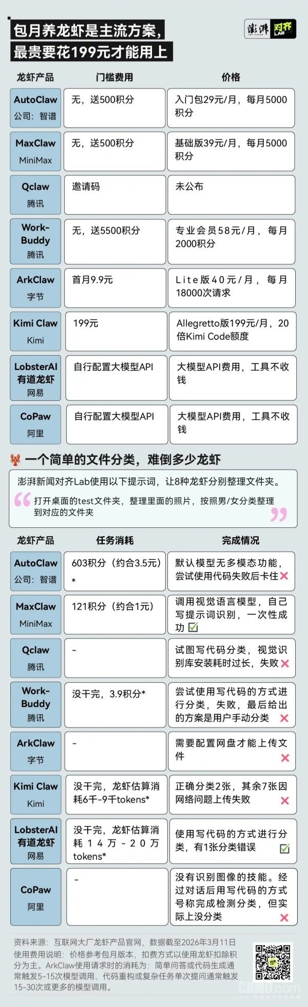 [CNMO科技消息]3月12日,《澎湃新闻》对齐Lab在成功配置开源版OpenClaw的基础上,结合一个月的“养虾”心得,对互联网大厂的8款类OpenClaw产品进行了测评。综合来看,大厂版“龙虾”降低了让普通人用命令行配置“养虾”环境的硬核门槛,但距离所谓的“一键安装”“零门槛上手”还有很大的差距。此外,“龙虾”的token消耗、安全性等问题也不容小视。