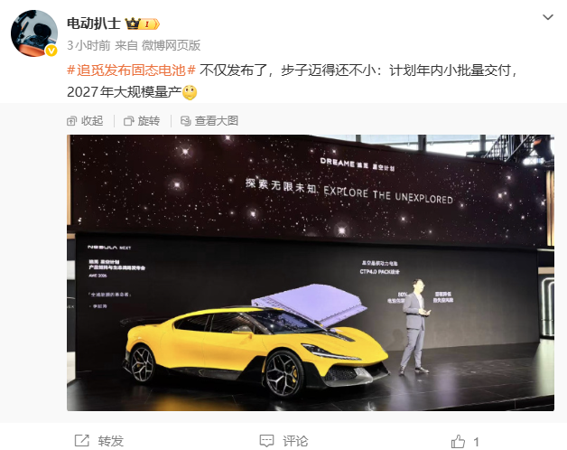3月12日消息,据博主电动扒士透露,在今日开幕的AWE2026中国家电及消费电子博览会上,智能科技企业追觅正式发布其自研车规级固态电池,并宣布:2026年内将实现小批量交付,2027年启动大规模量产。