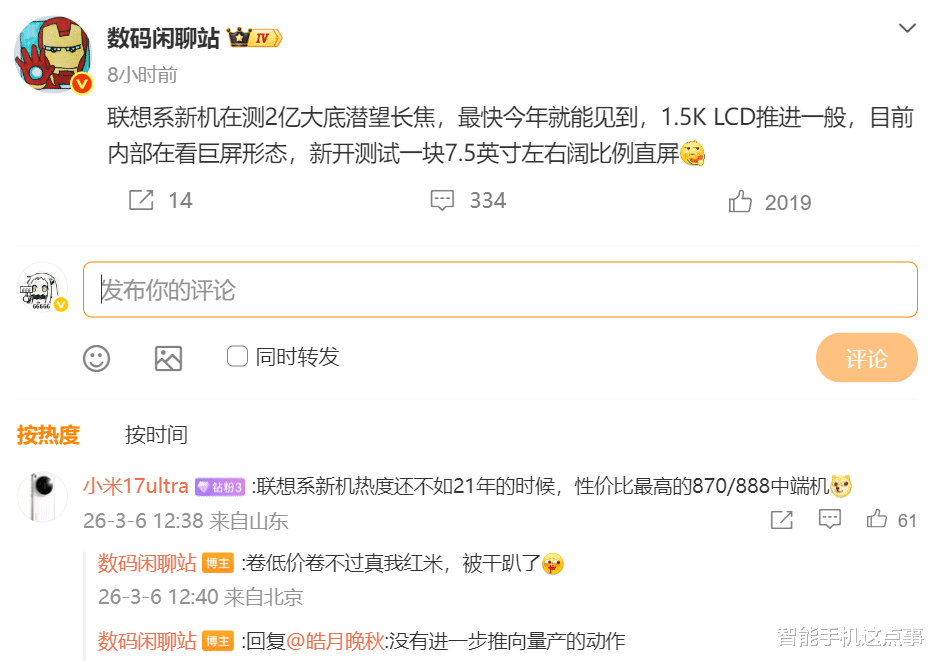 近期有博主爆料了联想新机的消息,但有网友进行了锐评,称联想系新机热度还不如21年的时候,性价比最高的870/888中端机。