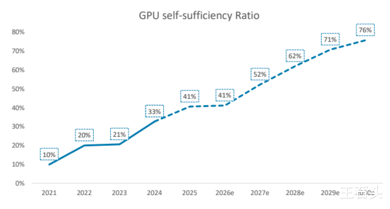 根据他们的测算,到2030年,咱们国家AI GPU芯片的自给率将从2024年的33%一口气飙升到76%。