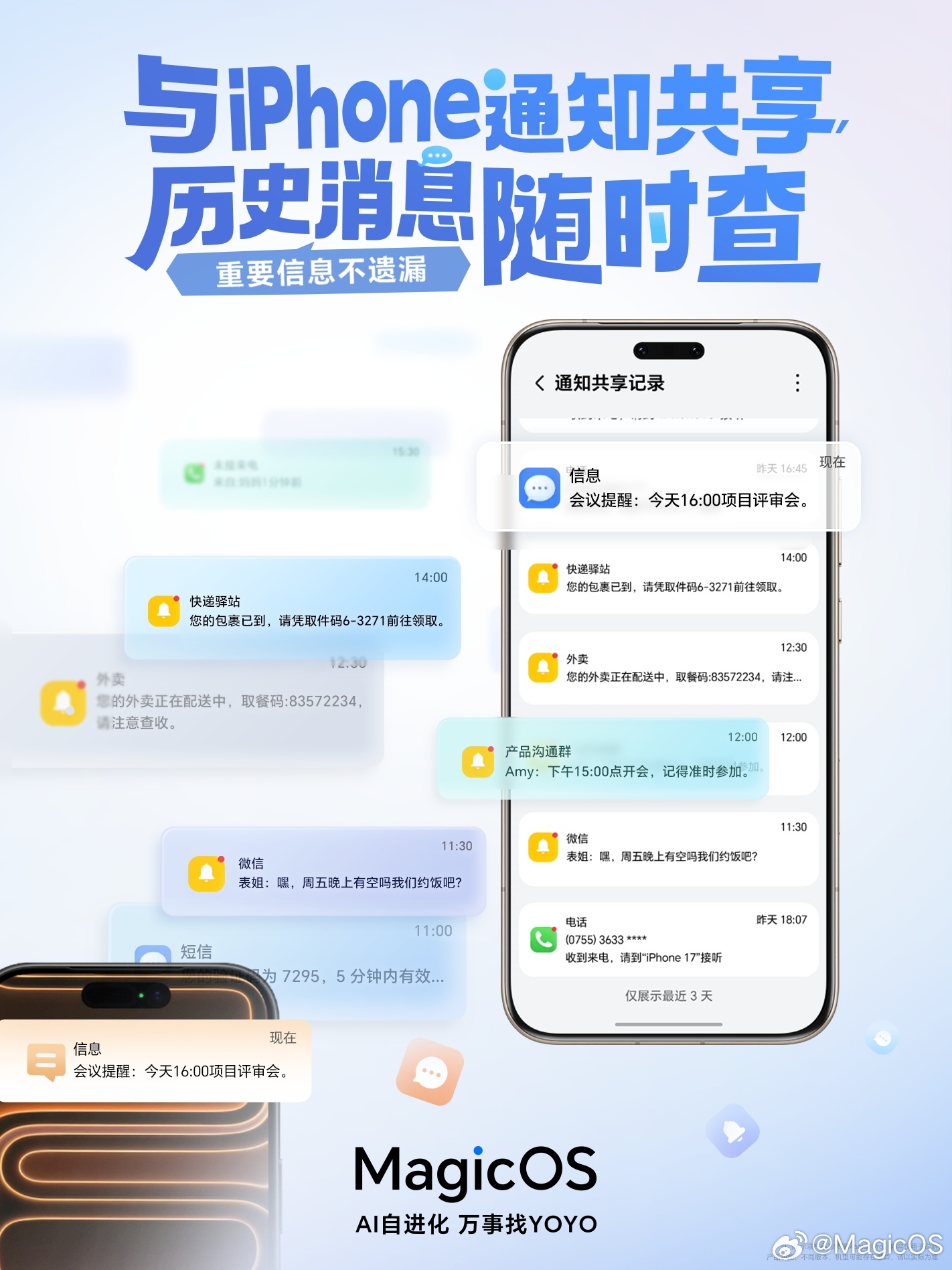 关于双机通知共享功能,根据官方描述,荣耀互联历史通知共享查看功能将支持旧消息一机回溯和新消息秒跨双机两大特性,可避免错过重要信息。