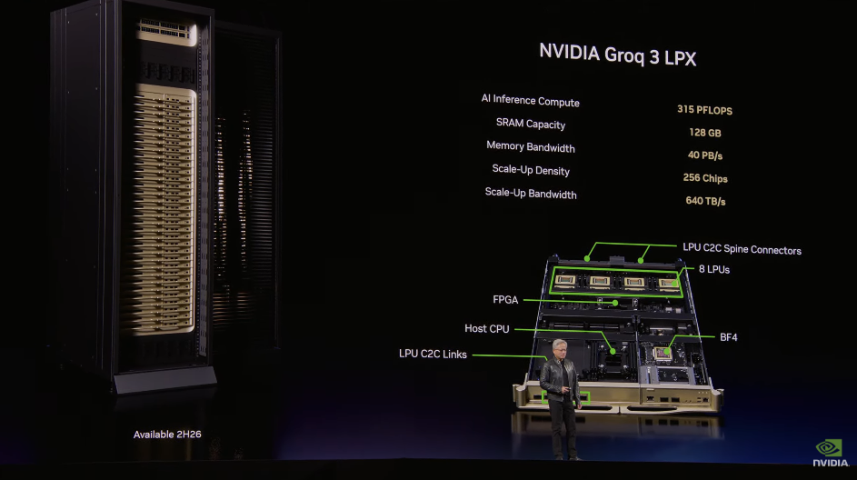 Groq3LPX机架搭载256个LPU处理器,提供128GB片上SRAM和640TB/s扩展带宽。LPX与VeraRubin平台结合后,推理吞吐量/功耗比将能提升35倍。黄仁勋介绍称,LPU芯片将由三星代工,预计今年机架将于今年下半年开始出货。