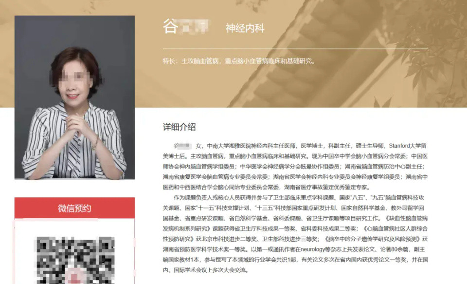 据中南大学湘雅医院公开资料显示,谷某某,现年58岁,为湘雅医院神经内科主任医师、医学博士、科副主任、硕士生导师,拥有斯坦福大学留美博士后经历,主攻脑血管病研究,其还担任中国卒中学会脑小血管病分会常委、湖南省脑血管病防治中心副主任等多个学术职务,并作为负责人或核心人员参与过多项国家级科研项目。