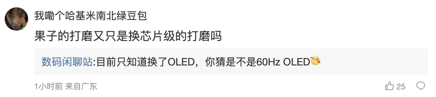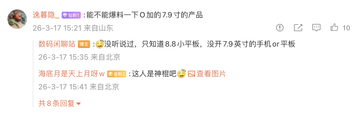 后续有用户在评论区询问:“果子的打磨又只是换芯片级的打磨吗”,博主回复道:“目前只知道换了OLED,你猜是不是60HzOLED”;另一名用户则询问道:“能不能爆料一下O加的7.9寸的产品”,博主则回复道:“没听说过,只知道8.8小平板,没开7.9英寸的手机or平板”。