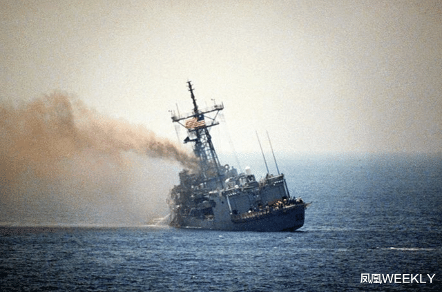 1987年,“油轮战争”中,美军“斯塔克”号护卫舰被伊拉克导弹击中。(图源:资料图片)