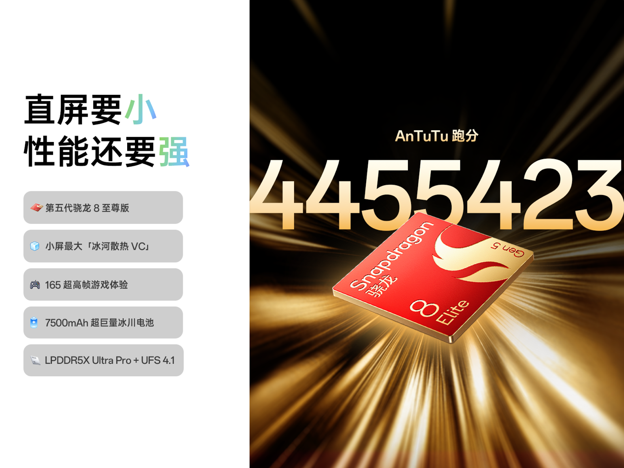 一加 15T 搭载高通迄今最强悍的第五代骁龙 8 至尊版移动平台,拥有超强性能的同时功耗更低,在独家自研芯片级游戏技术新一代「风驰游戏内核」加持下,可带来「满级战力,持久流畅」的游戏表现,同时还拥有小屏唯一的 165 超高帧游戏生态。散热方面,一加 15T 内置冰河散热系统和 5150mm² 小屏最大散热 VC,在有限机身空间内做到散热效率最大化,真正实现对 SoC 性能的满血释放,实力诠释小屏性能巅峰。