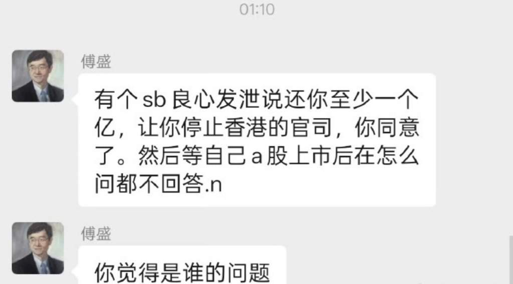 他补充称,“有个xx良心发现说还你至少一个亿,让你停止香港的官司,你同意了。然后等自己A股上市后再怎么问都不回答,你觉得是谁的问题”。