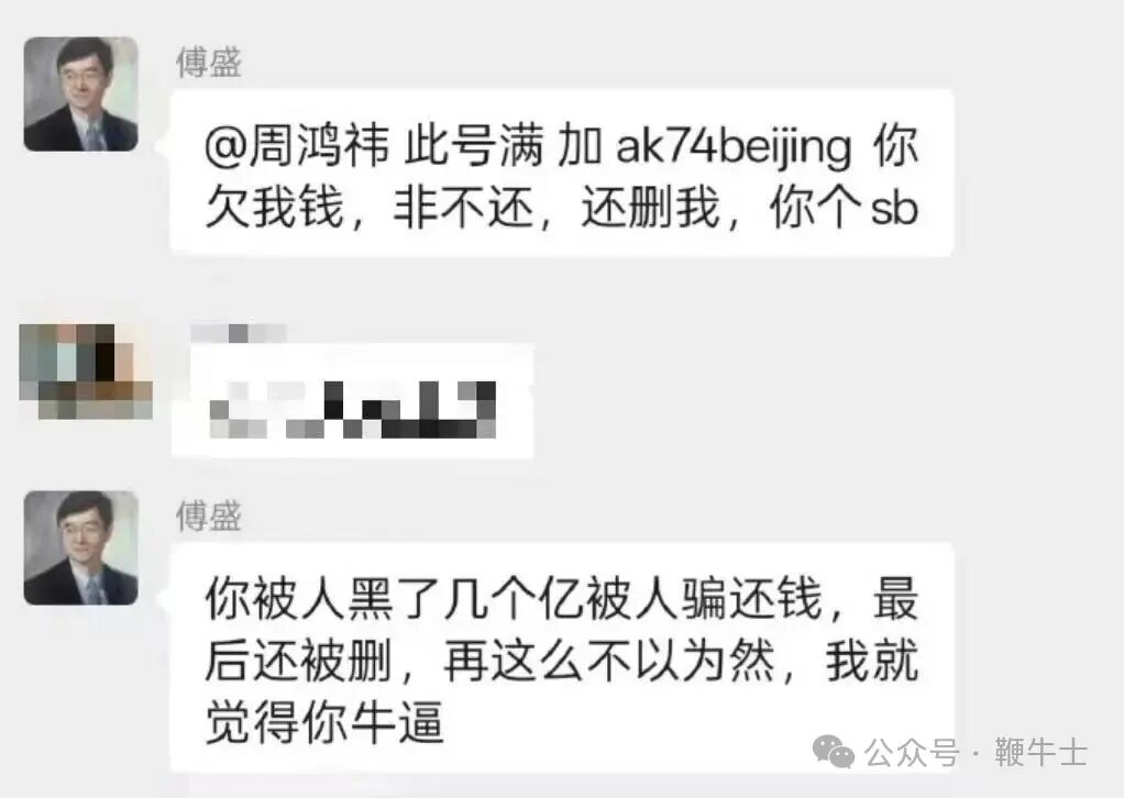 傅盛在群内直言,“你欠我钱,非不还,还删我,你个xx。”他还表示,“你被人黑了几个亿被人骗还钱,最后还被删,再这么不以为然,我就觉得你牛逼。”
