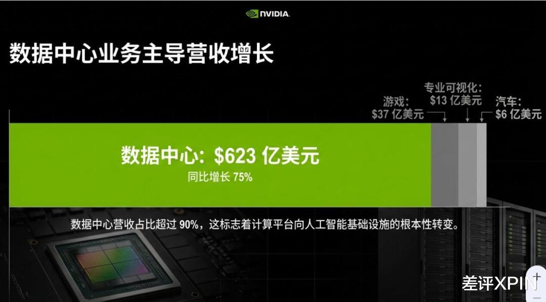 在英伟达去年 Q4 财报里,数据中心的营收达到了 623 亿美元,占比超过 90%,是汽车业务的 100 多倍。