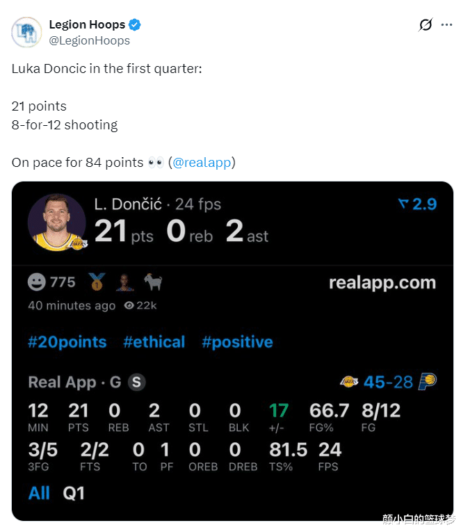 东契奇首节的手感非常好,尤其是他外线开了后就防不住了,单节12分钟,12中8,三分5中3,罚球2中2,拿到21分2助攻,命中率66.7%,三分命中率60%,真实命中率81.5%,正负值+17。