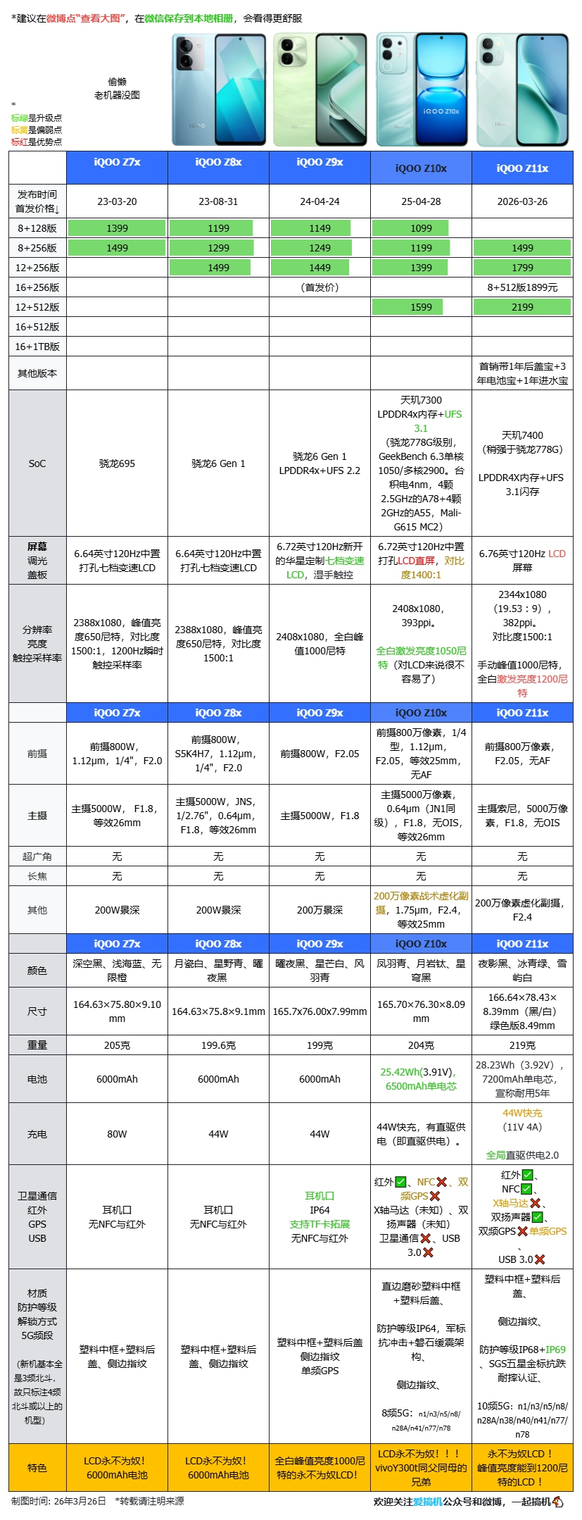 例牌:【iQOO Z11x】与iQOO Z7x到Z10x对比↓。