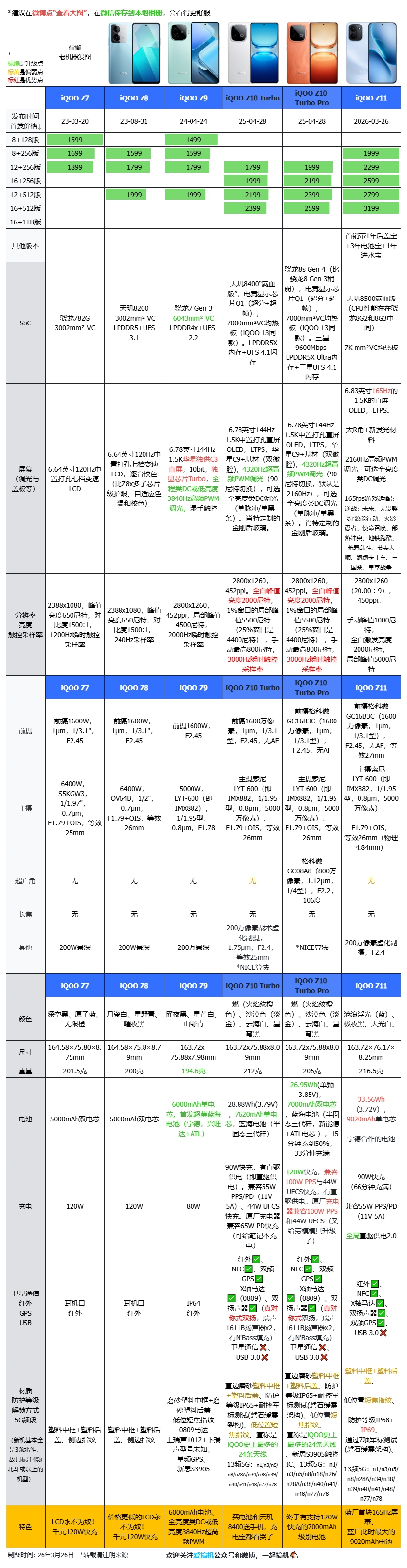 【iQOO Z11】与REDMI Turbo 4 Pro/Turbo 5、荣耀Power2、真我Neo7 SE、iQOO Z10 Turbo/Z10 Turbo Pro对比↓。