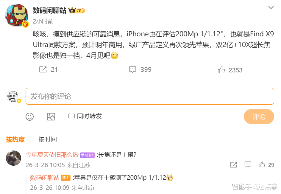 原因是近期有博主爆料,供应链可靠信息显示苹果正在评估2亿像素1/1.12英寸主摄传感器方案,巧了这套方案正是即将于4月发布的OPPO Find X9 Ultra的核心配置。