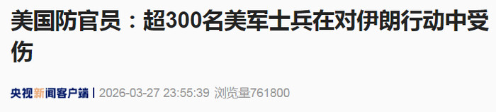 当地时间3月27日,一位美国国防部官员透露,自针对伊朗的作战行动开始以来,已有超过300名美军士兵在行动中受伤。该官员称,在这些伤员中,超过75%的伤情涉及创伤性脑损伤。