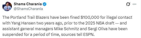 据ESPN名记Shams报道,开拓者因在选秀前两年(2023年12月)与杨瀚森非法接触被罚款10万美元,球队助理总经理塞迈克·施密茨和塞尔吉·奥利瓦两名高管皆被停薪、停职两周。