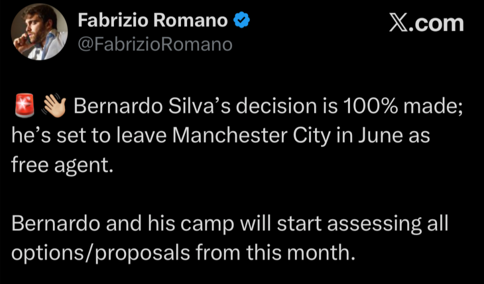 合同仅剩半年的他,本月起已经和自己的团队将评估所有方案和提议。目前,B席在曼城周薪高达30万英镑。他的离开,也将帮助曼城释放巨大的薪酬空间。
