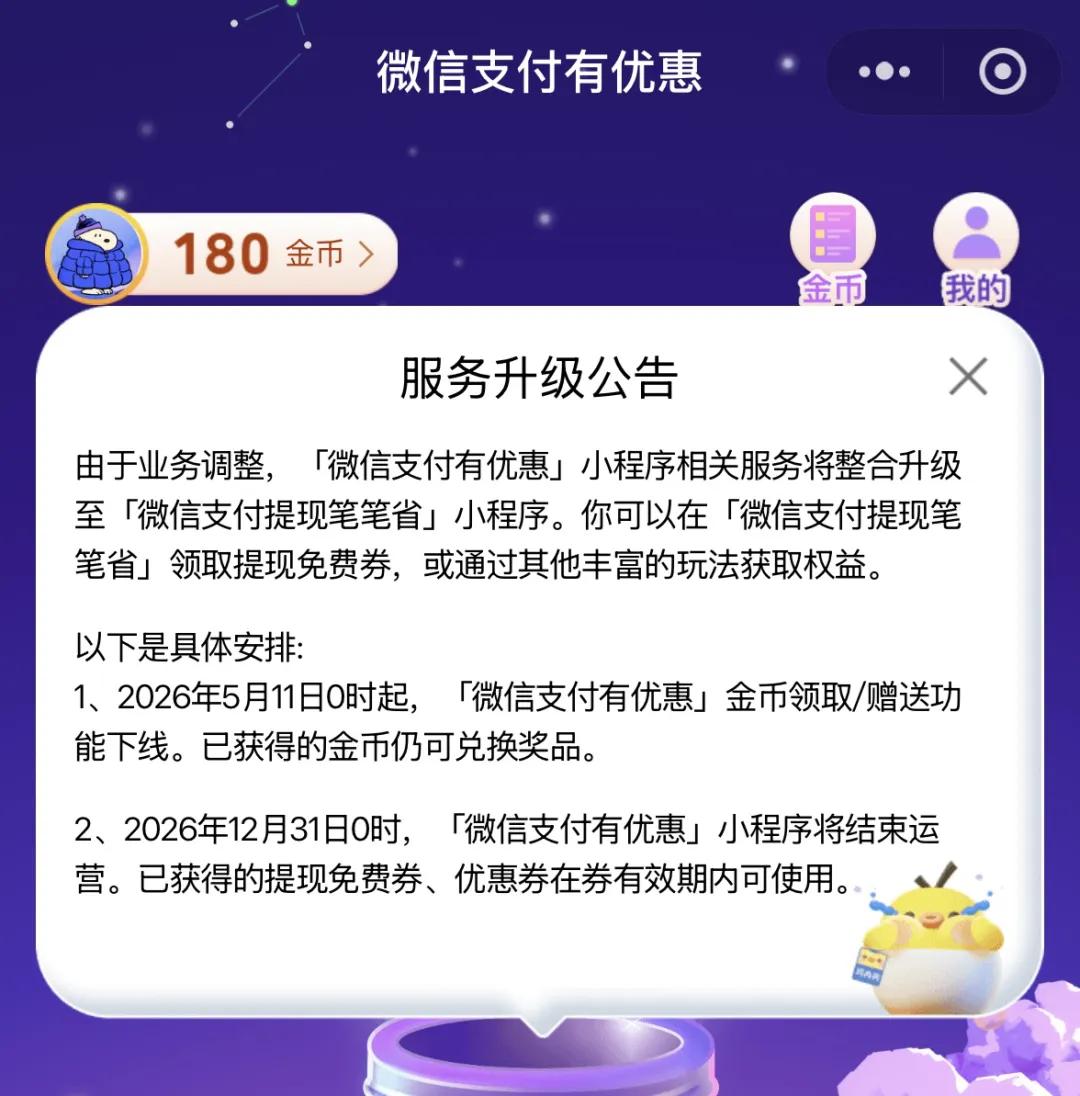 然而,最近微信官方对该功能做出调整,宣布将于2026年12月31日正式关停“支付有优惠”小程序;并从5月11日起,下线其金币领取/赠送功能。