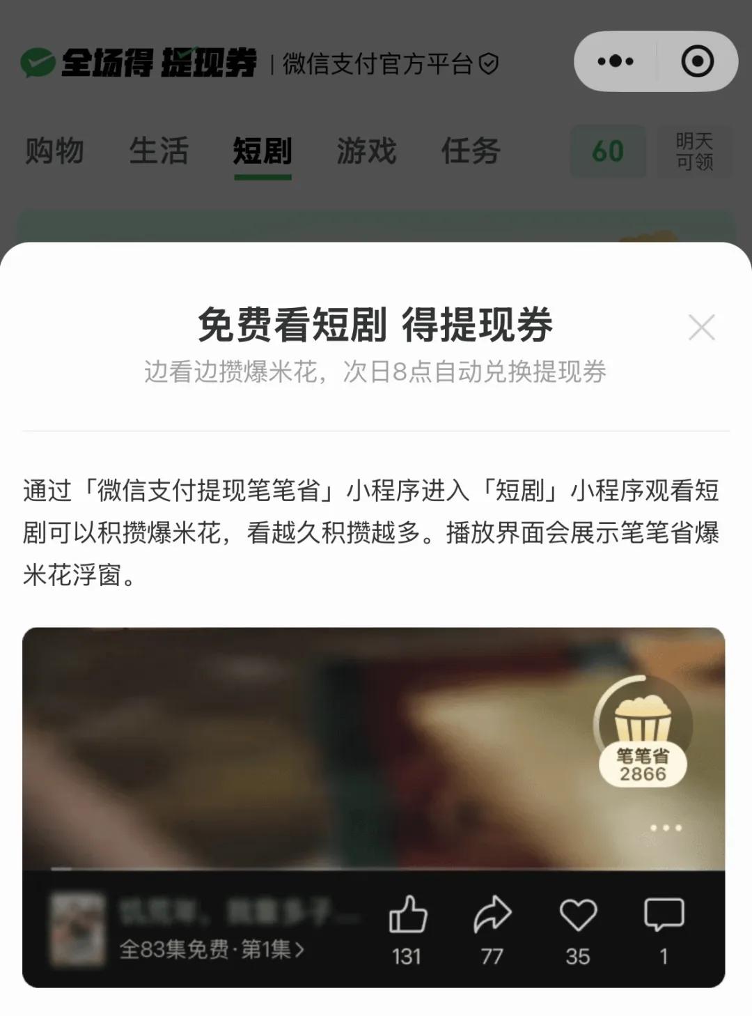 好在“领取提现免费券”的功能并没有完全下线,而是转移到“微信支付提现笔笔省”小程序中,用户可以通过线上购物、刷短剧、玩游戏、做任务等方式来换取提现券。