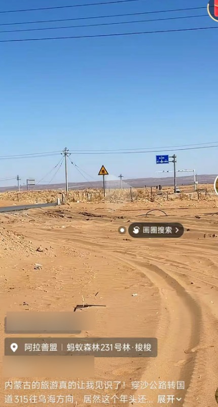 4日,游客胡女士告诉极目新闻记者,3日他们准备驾车从内蒙古阿拉善盟西部梦幻峡谷前往乌海市,使用某地图软件进行导航,指引的是一条先走“穿沙公路”再走315省道的路线。可在行经八十公里至“蚂蚁森林231号林”位置,即将右拐到315省道时发现,道路被高高的沙堆堵住,无法通行。