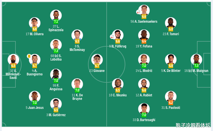 那不勒斯首发:32-瓦尼亚、5-胡安(85'31-别克马)、4-布翁乔尔诺、17-奥利维拉、3-古铁雷斯、68-洛博特卡、99-安古伊萨、37-斯皮纳佐拉(74’21-波利塔诺)、11-德布劳内(85'20-埃尔马斯)、8-麦克托米奈、23-吉奥瓦尼(70’27-阿利松·桑托斯)。