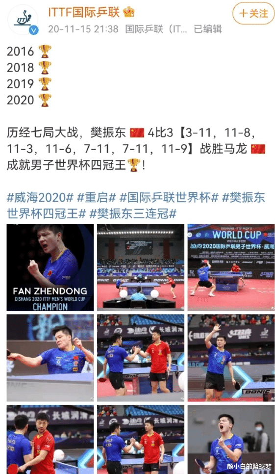 在2020年就连ITTF官方都为樊振东呐喊助威,当时樊振东4-3击败马龙成就男子世界杯四冠王。鲜衣怒马少年郎,不负韶华行且知,那时候的小胖是多么的意气风发啊。